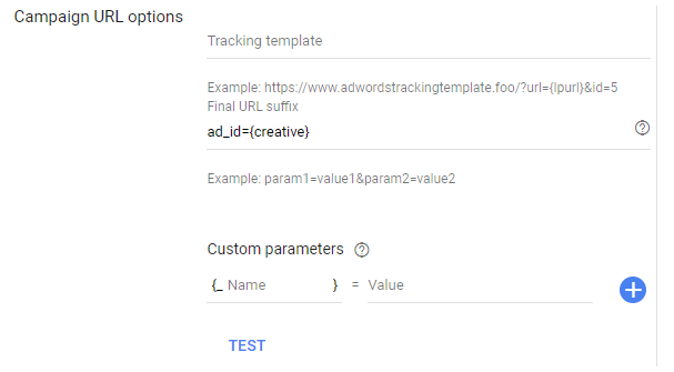 When tracking Google Ads with SegMetrics, you need to configure your ads with the appropriate tracking value. To track ad-spend effectively, you need to add ad_id={creative} to the Final URL Suffix in the Ad URL Options.
