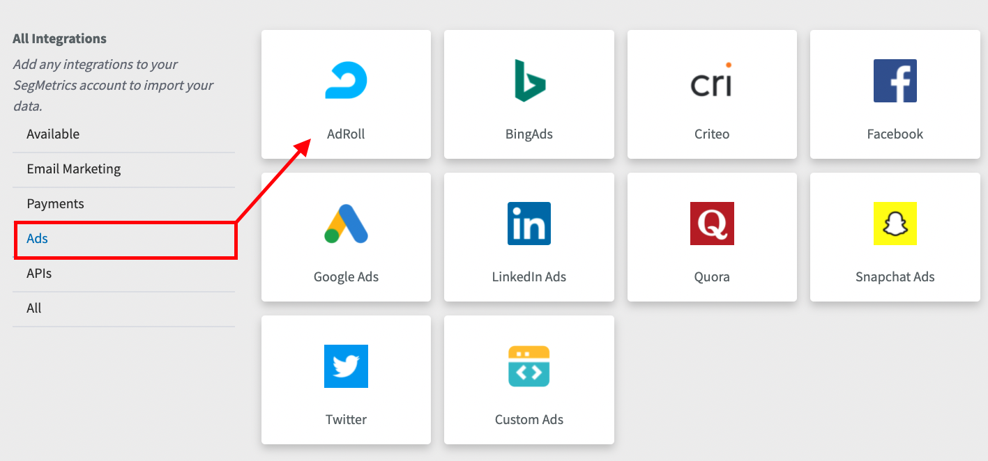 - Once you're on the Integrations page, click on the AdRoll integration