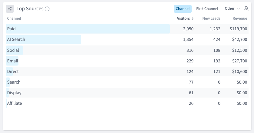 - AI Search - Organic channel recorded by an AI platform referral, such as Claude, ChatGPT, Gemini, etc.