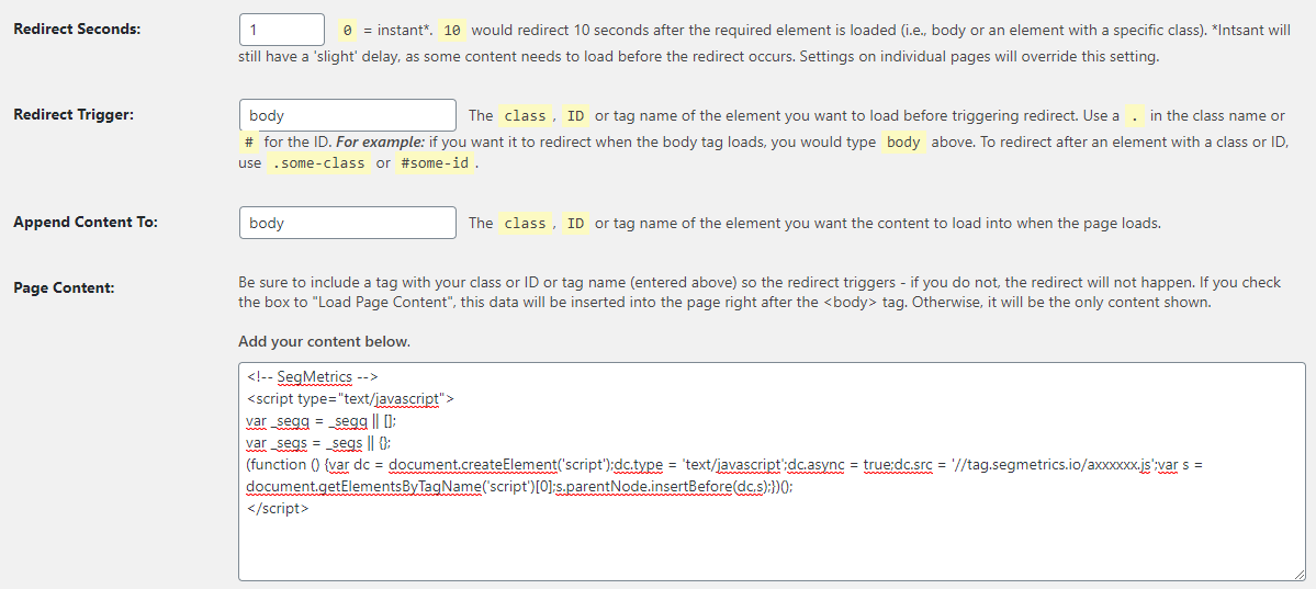 - In the Page Content section, add your SegMetrics Pixel from your Site Setup page (https://app.segmetrics.io/a/settings/snippet).