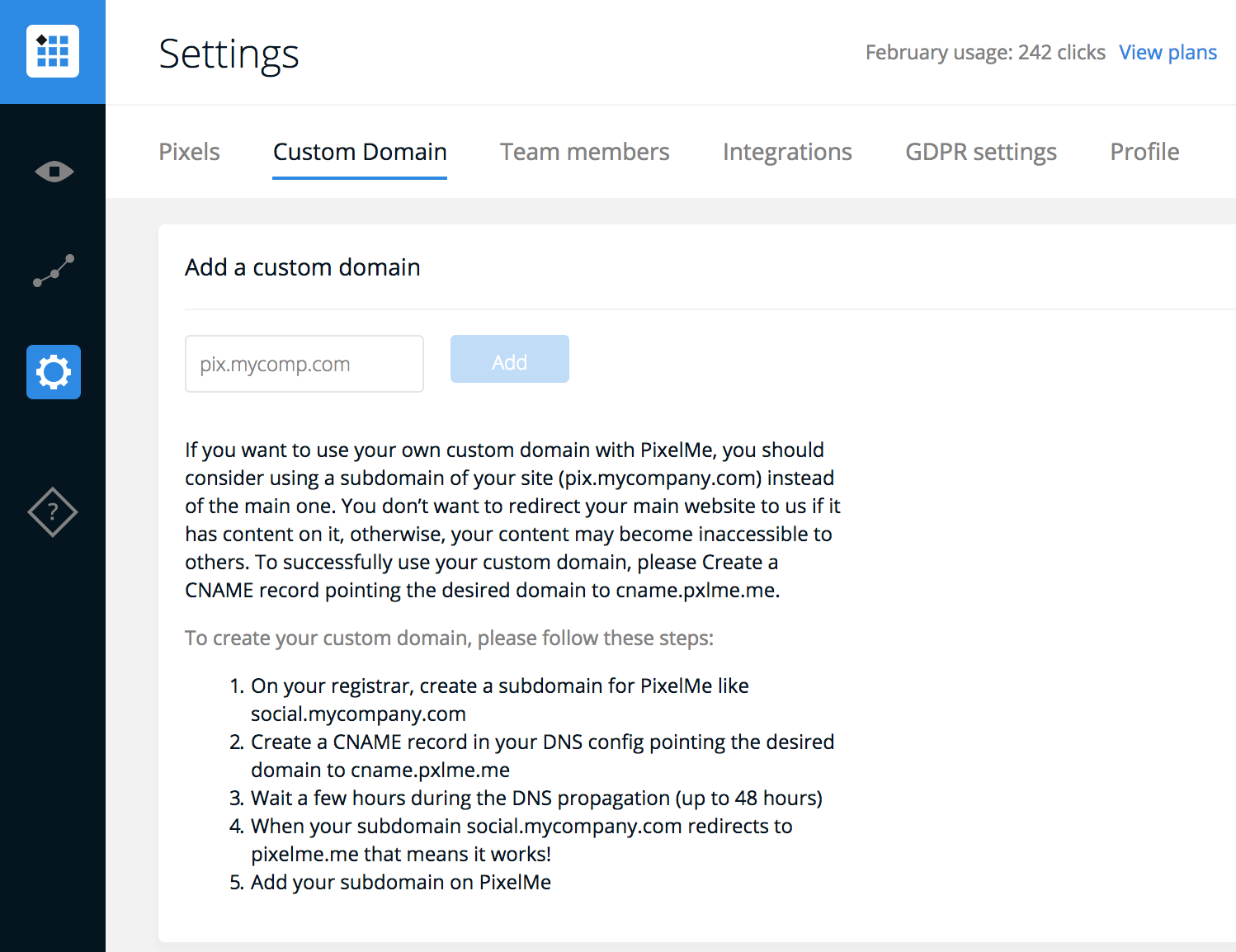 - Follow the PixelMe's instructions for setting up your CNAME and DNS.