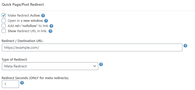 - Under the Quick Page/Post Redirect heading, check the box next to Make Redirect Active