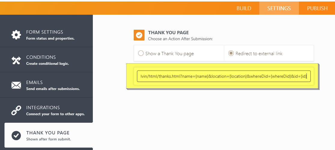 - In your JotForm, click on Thank You Page and choose Redirect to External Link.