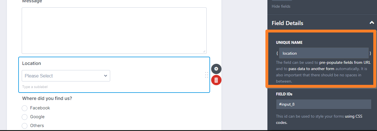 - Click on the Email field in your form, and get the Unique Name of the field. If you're not sure how to get the Unique Name, you can follow JotForm's guide.