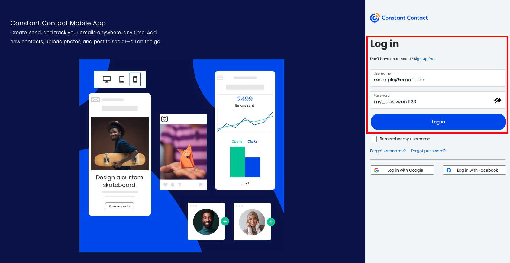 - Once redirected to the Constant Contact login page, enter your Constant Contact login credentials and click Log in