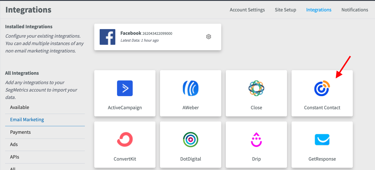 - Head over to the Integrations page (https://app.segmetrics.io/a/integration) in your SegMetrics account