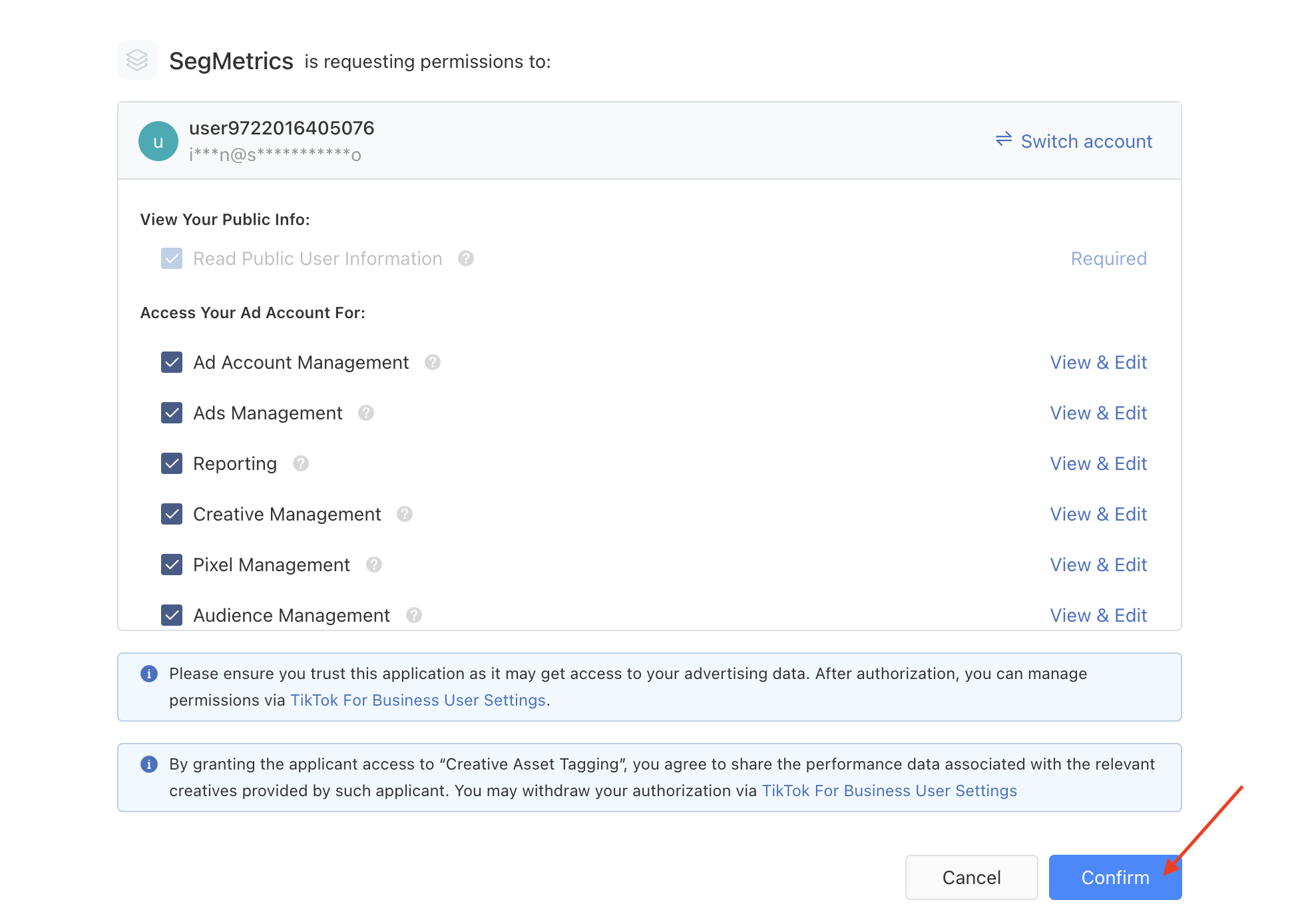 - If you're not already logged into your TikTok Account, you will be prompted to do so. TikTok will request permissions to access your ad account data. Click Confirm to grant SegMetrics the necessary permissions including: