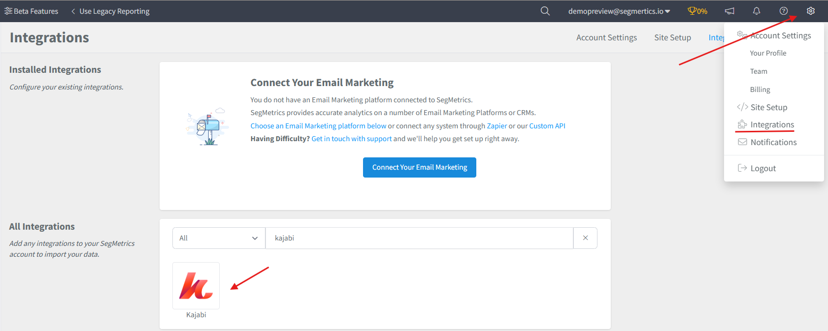 - Contact SegMetrics Support: You must contact help@segmetrics.io to enable the Kajabi integration
