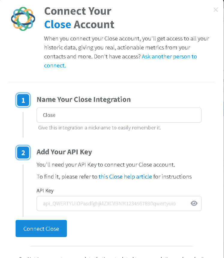 - Enter your Close.io API Key in the provided field in SegMetrics