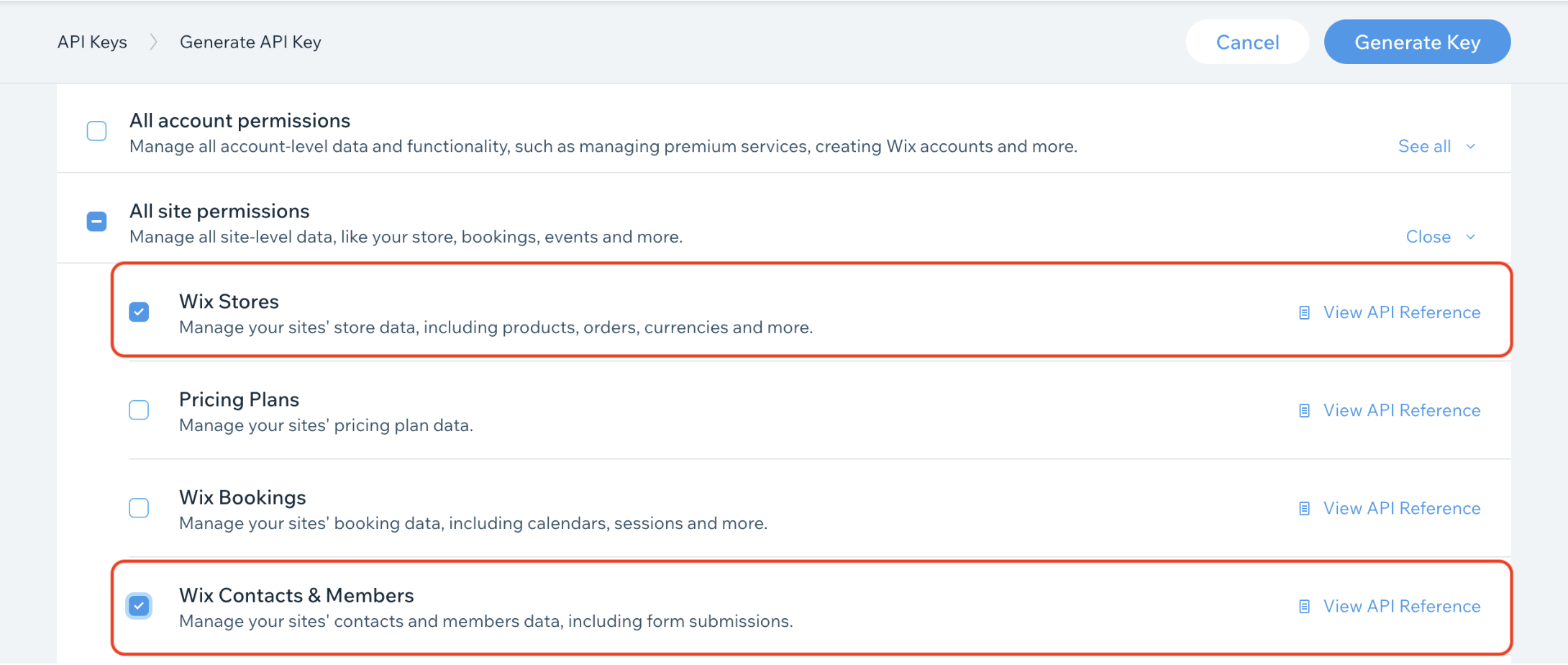 A: You must grant Wix Stores and Wix Contacts & Members permissions under the All site permissions section when generating your API key in Wix Account Settings.