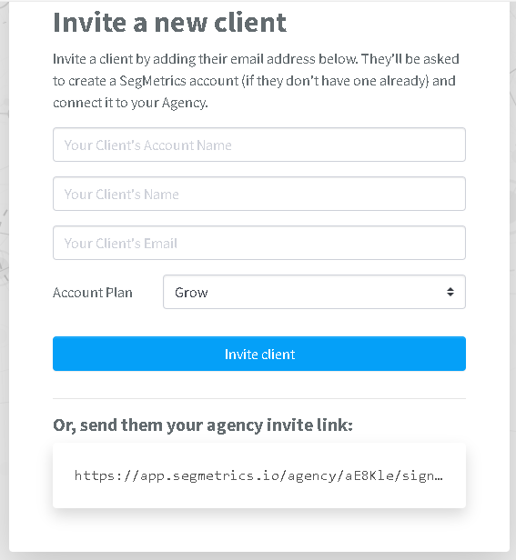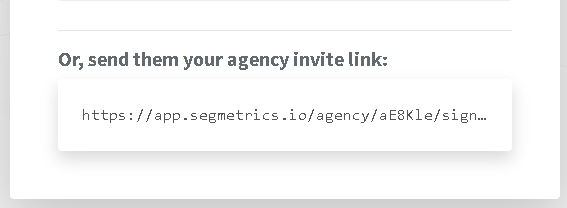 When you invite clients, they receive an email with your agency registration link or you can share the invite link directly. Clients then create their own SegMetrics account using their own payment method. \ NOTE: You can still setup the account yourself as long as the below criteria are met