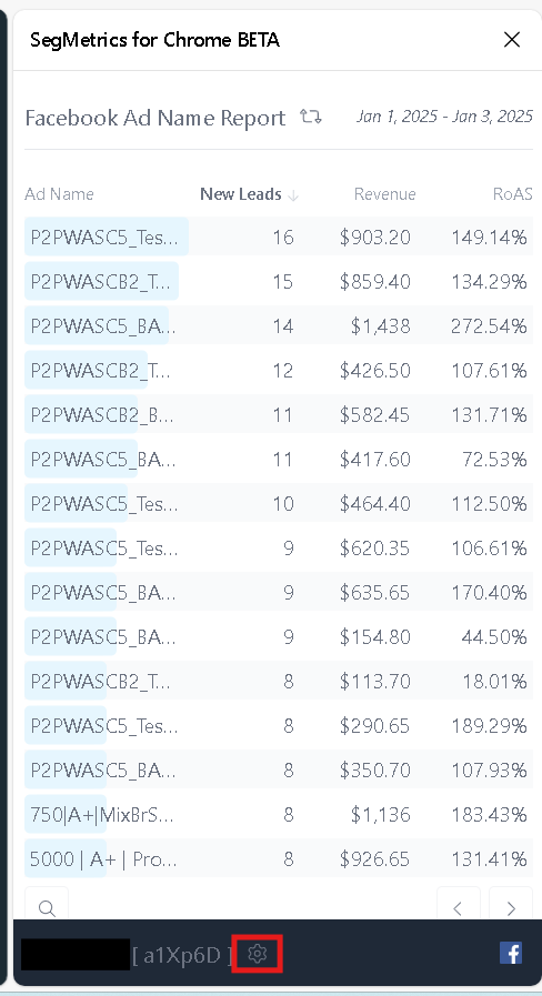 The extension synchronizes with your current ads manager view, showing relevant SegMetrics data for the campaigns, ad sets, or ads you're currently viewing. Data refreshes automatically as you navigate through different sections. \ The SegMetrics data in the extension updates as often as the rest of your SegMetrics data within your account.