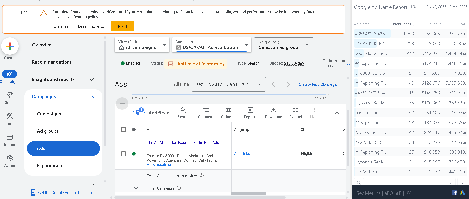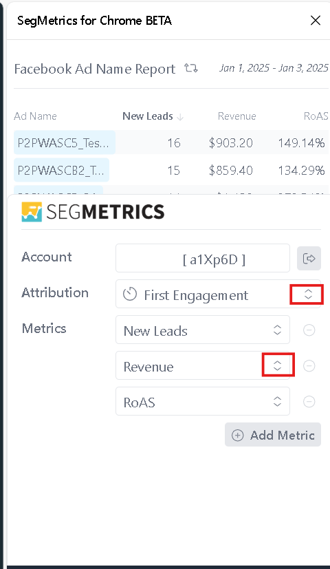 - Comprehensive Metrics: Access many of the same metrics available in SegMetrics reports directly within your ads manager interface.