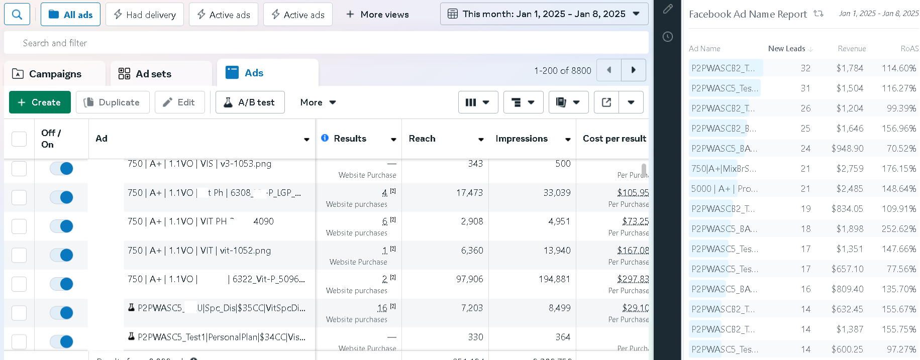 Once configured, the extension automatically displays SegMetrics data on the right side of your ads manager interface. The extension updates automatically when you navigate between:
