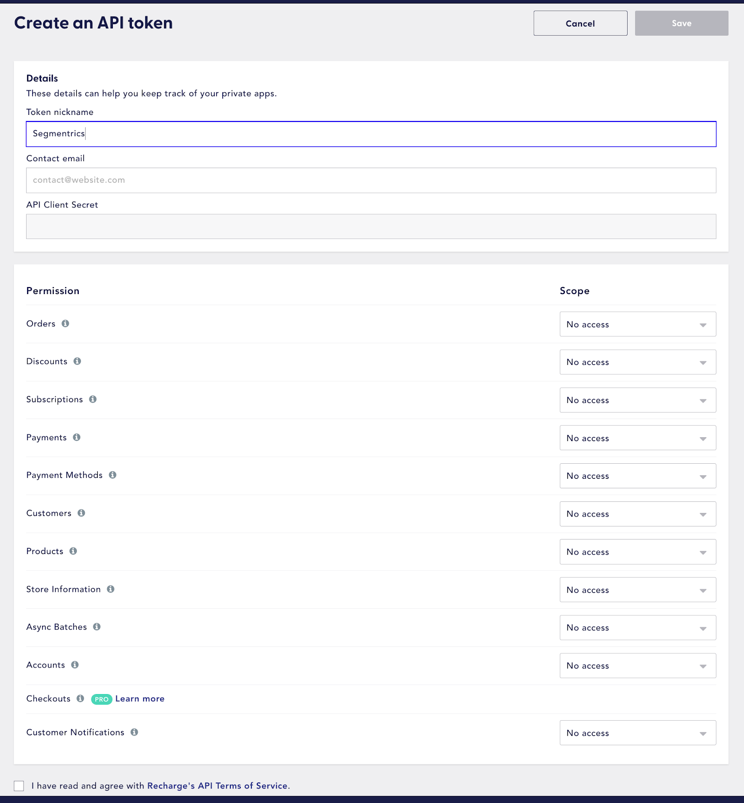 Before connecting ReCharge to SegMetrics, you need to request an API token from ReCharge support and configure the appropriate permissions.