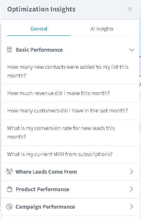 The Optimization Insights panel will open, displaying two tabs: General (for common business questions) and AI Insights (for automated trend detection).