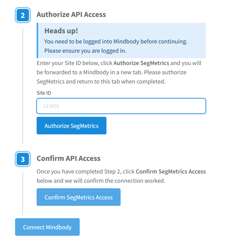- Click "Authorize SegMetrics" - you'll be forwarded to MindBody in a new tab