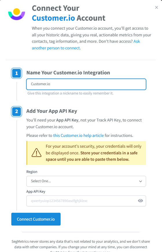 If you have a payment processor that doesn't connect with Customer.io natively, we can connect that in SegMetrics information together using the email addresses in Customer.io. You don't need to import people in a special way: they just need to be in your Customer.io account!