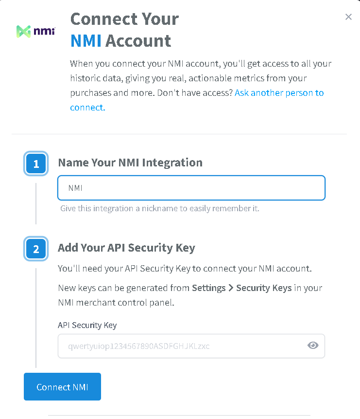 - Follow the prompts to get your API Security Key from your NMI merchant control panel