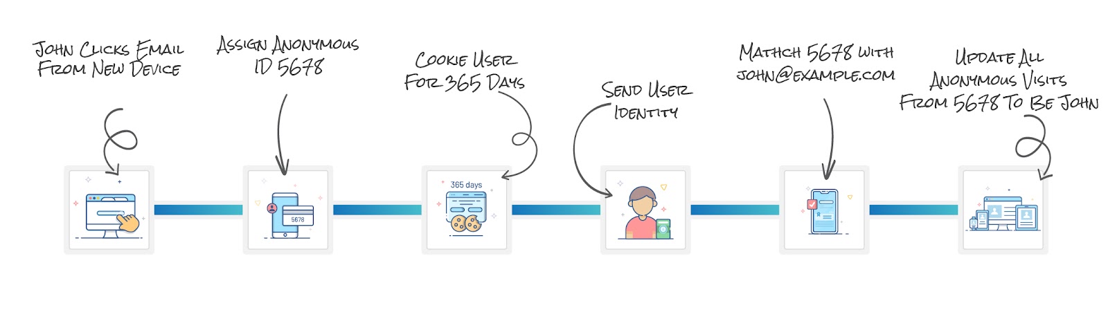 - SegMetrics updates all anonymous visits that match the unique ID and associates that data with john@example.com