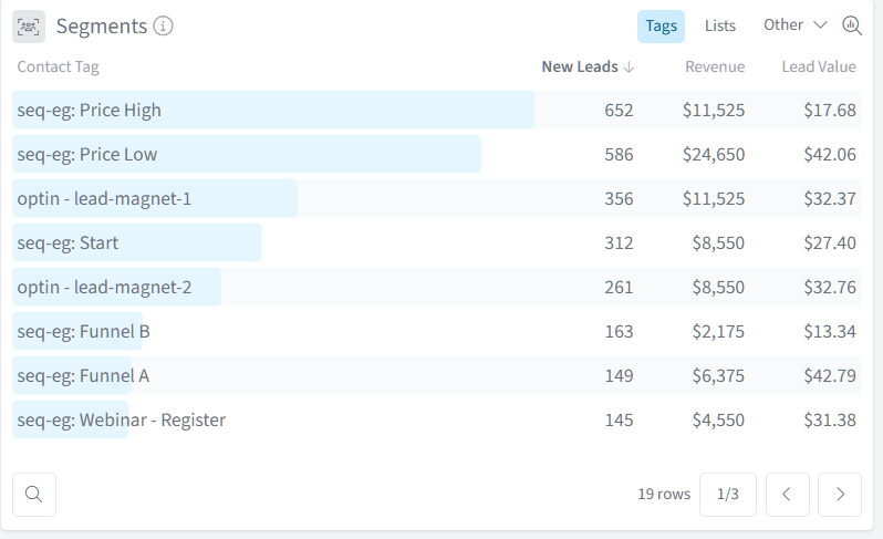 Why it's useful: Segment analysis reveals which marketing campaigns, lead magnets, or customer types generate the most value. This is very useful for tracking metrics like booked calls, webinar registrations, etc.