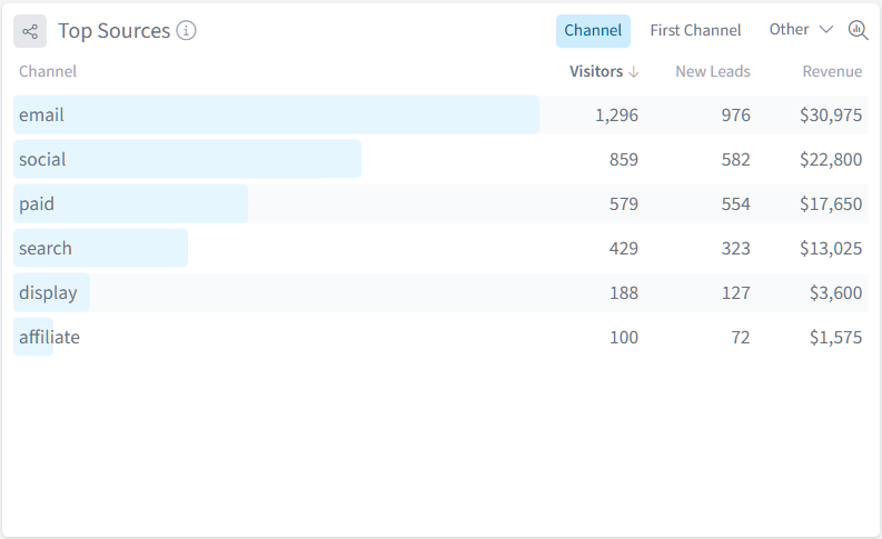 The Top Sources table breaks down your acquisition performance by marketing channel, showing which sources drive the most visitors, leads, and revenue.