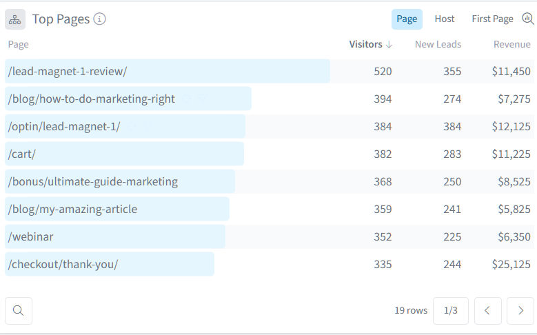 What it shows: Individual page URLs with their corresponding visitor, lead, and revenue metrics.
