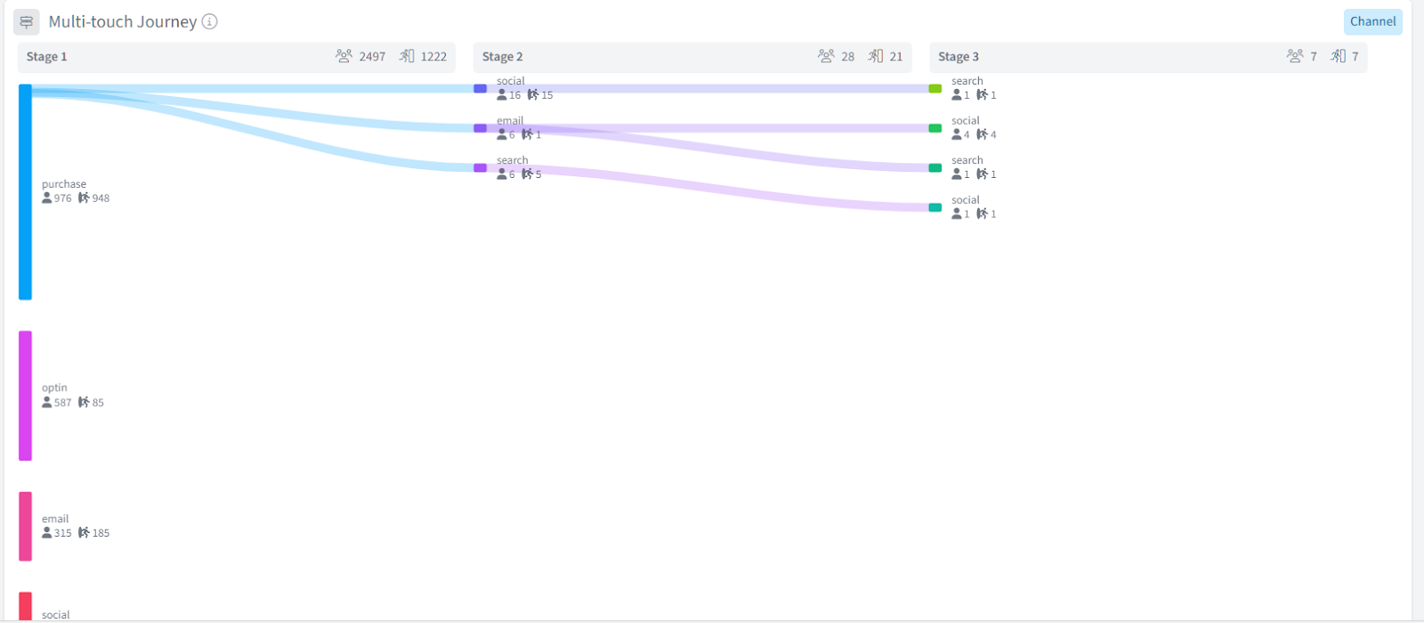 What it shows: A Sankey diagram displaying the flow of customers through up to three stages of touchpoints before purchase.