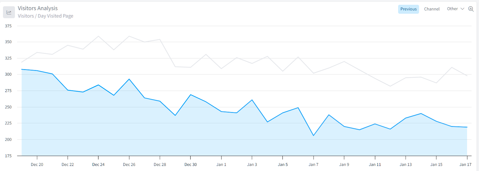 The chart analysis chart shows your page view trends over time, comparing the current period (blue line) to the previous period (gray line).It defaults to page views but you can select any of the top line metrics and the chart will adjust and reflect that data.