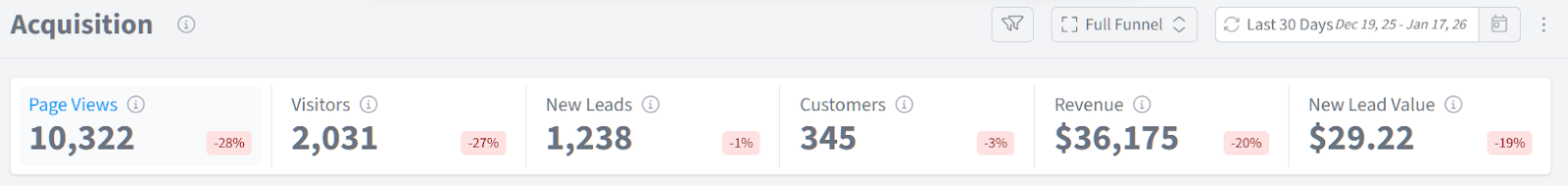 At the top of the Acquisition Report, you'll see six key performance indicators that provide an at-a-glance view of your acquisition performance. Each KPI shows the current value for your selected timeframe, along with a percentage comparison to the previous period.