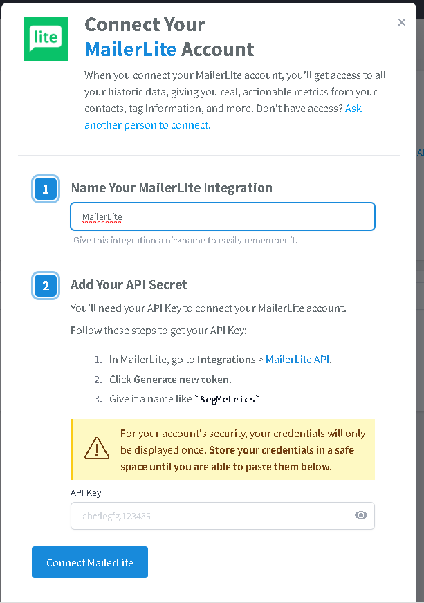- You'll be prompted to enter your MailerLite API key