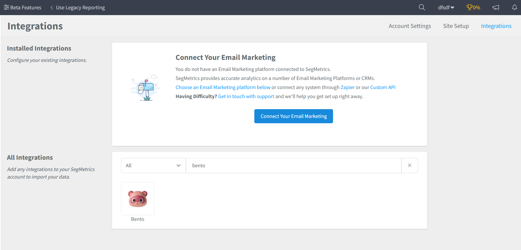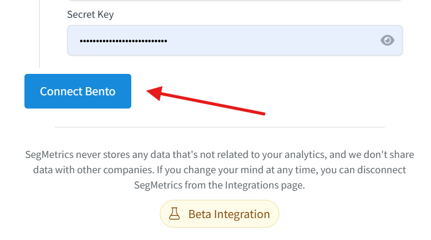 Q3: How do I complete the connection between Bento and SegMetrics? Once you have your Bento credentials, go to Settings → Integrations in SegMetrics, select the Bento integration, give it a clear name, paste in your Publishable Key, Secret Key, and Site UUID into the corresponding fields, then click Connect Bento to finalize the setup.