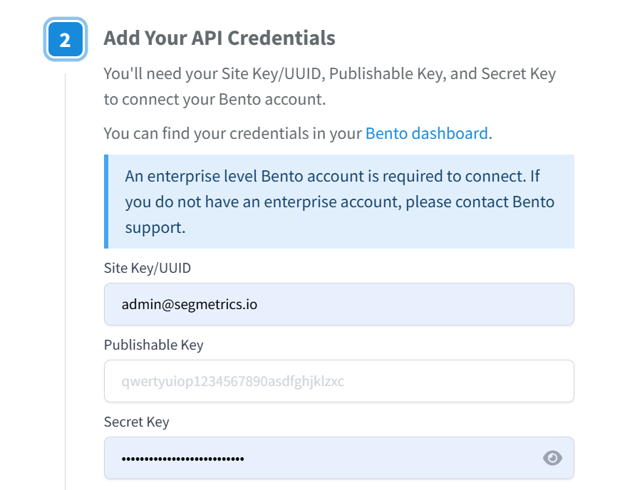 Q2: What API credentials do I need to connect Bento to SegMetrics? You'll need three credentials from your Bento account: your Publishable Key, Secret Key, and Site UUID. These can all be found by logging in to Bento and navigating to Settings → API Keys.