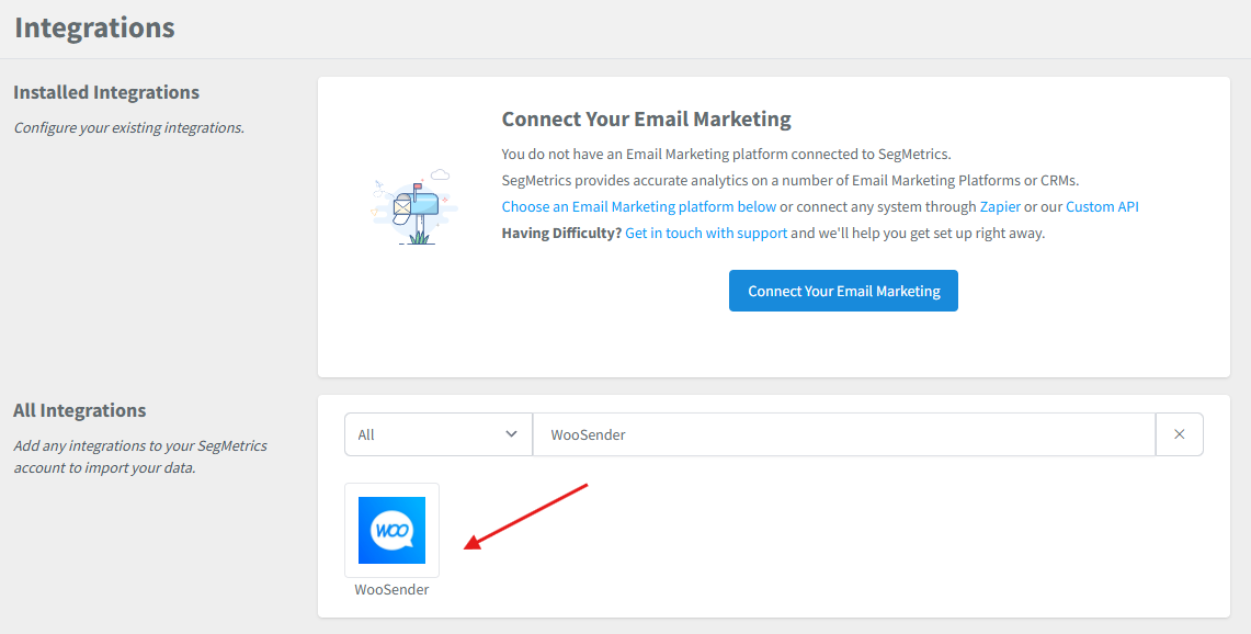 - Once redirected back to SegMetrics, confirm that the WooSender integration appears as Connected or Active in your integrations list.