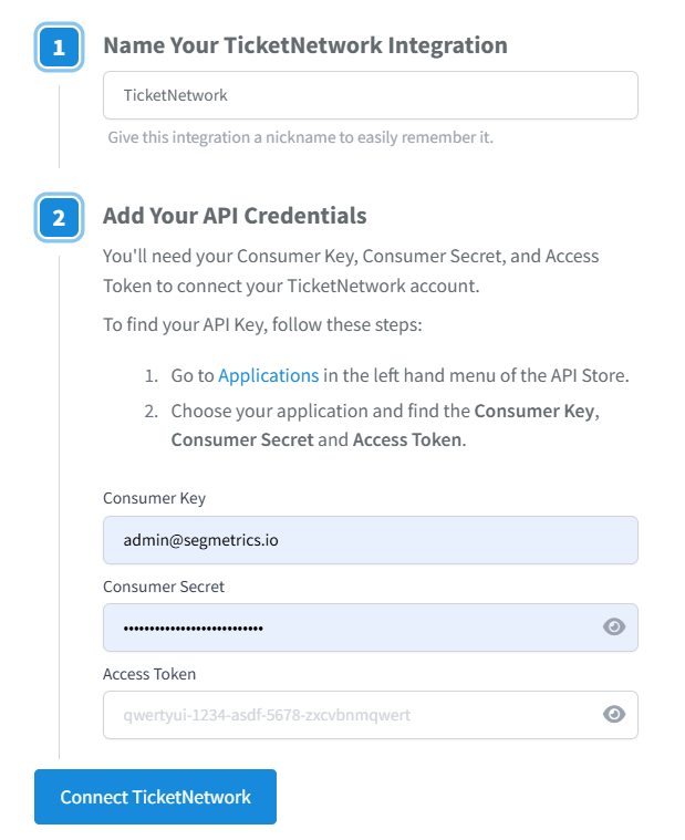 A: Once you have your credentials, go to Settings then Integrations in SegMetrics, select the TicketNetwork integration, give it a clear name, enter your Consumer Key, Consumer Secret, and Access Token into the corresponding fields, and click Connect TicketNetwork to finalize the setup.