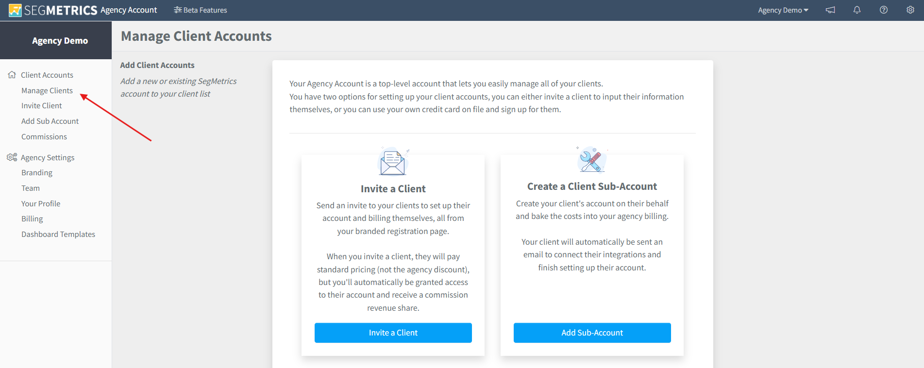 As an Agency account holder in SegMetrics, you can add, invite, and remove client accounts directly from your Agency dashboard. This article walks you through how to access the Manage Clients section and how to remove a client from your agency.