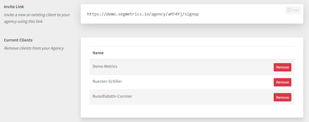 Current Clients This section lists all client accounts currently connected to your agency. Each client is shown by name, with a Remove button to the right. Clicking Remove will disconnect that client from your agency account.