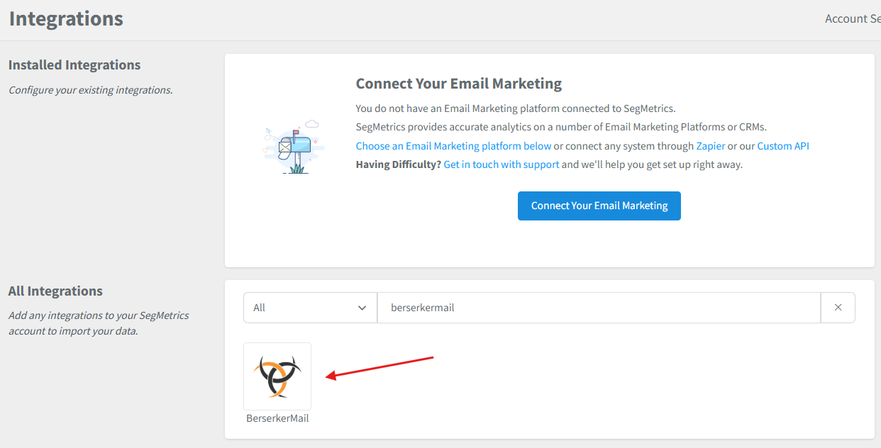 A: Go to Settings then Integrations in SegMetrics, select the BerserkerMail integration, give it a clear name, paste in your API Key, and click Connect BerserkerMail to finalize the setup.