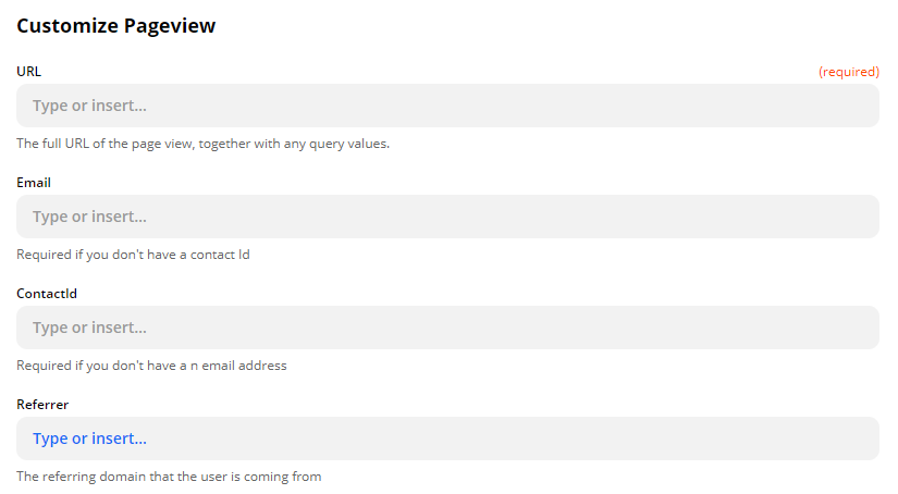 Creates a page view event for a contact in SegMetrics. This is useful when connecting call-tracking software like WhatConverts or CallRail to SegMetrics. The URL should contain all UTM fields and information you want to pass to the page view event. If you pass a Contact ID, ensure it matches the Contact ID from your main CRM. If you use an email address, SegMetrics will match that contact with your CRM on the next import.