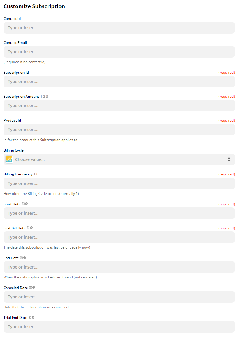 Adds a subscription record into your SegMetrics account. If you pass a Contact ID, ensure it matches the Contact ID from your main CRM. If you use an email address, SegMetrics will match that contact with your CRM on the next import. If you pass a Subscription ID that already exists, that data will be updated.