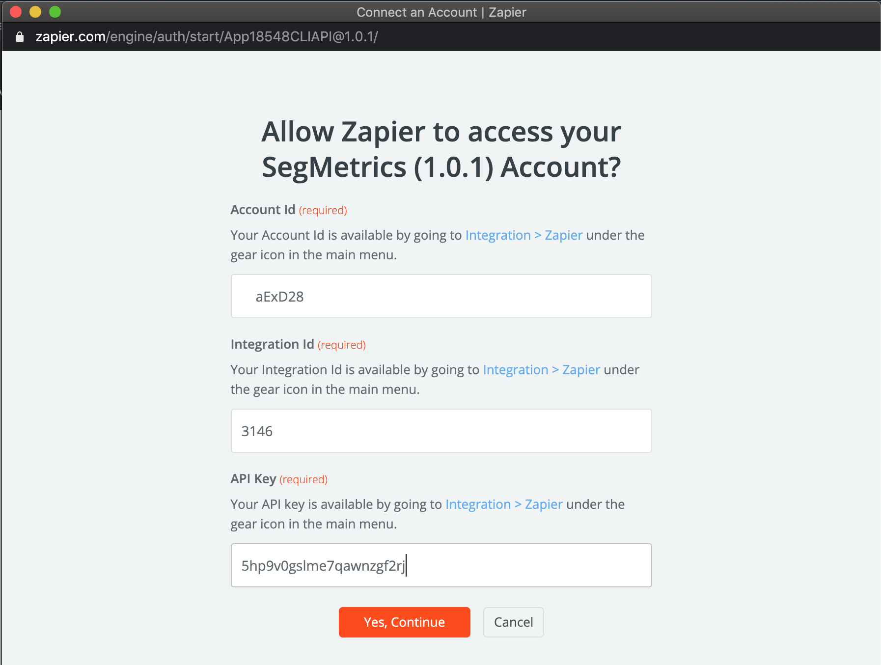 - When prompted, enter your SegMetrics API credentials from the Connect Your Account screen in SegMetrics